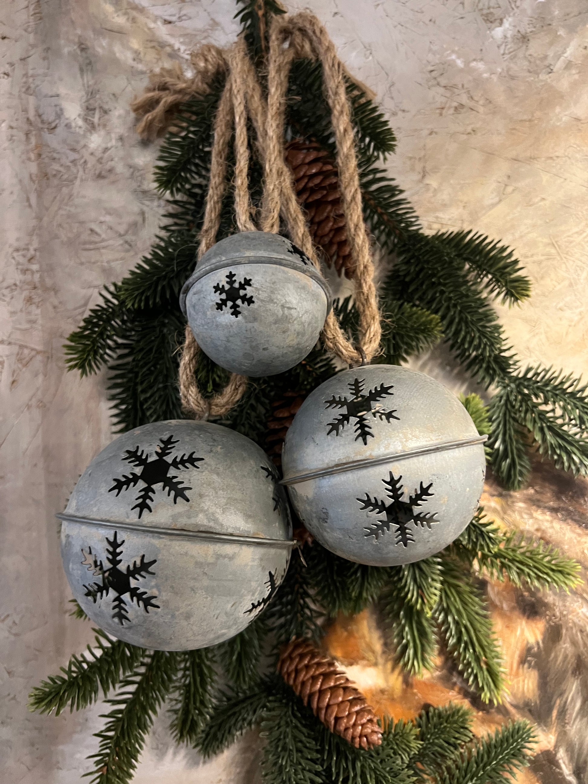 Breng een rustieke kerstsfeer in huis met deze prachtige metalen bellen in drie maten. De grijs-zilveren afwerking en uitgesneden sneeuwvlokken geven een authentieke, landelijke uitstraling. Perfect om op te hangen aan een deur, muur of kerststuk met dennentakken en dennenappels. De stevige jute touwlussen maken het eenvoudig om ze op te hangen. Combineer de verschillende formaten voor een sfeervol, winterse accent in jouw kerstdecoratie.