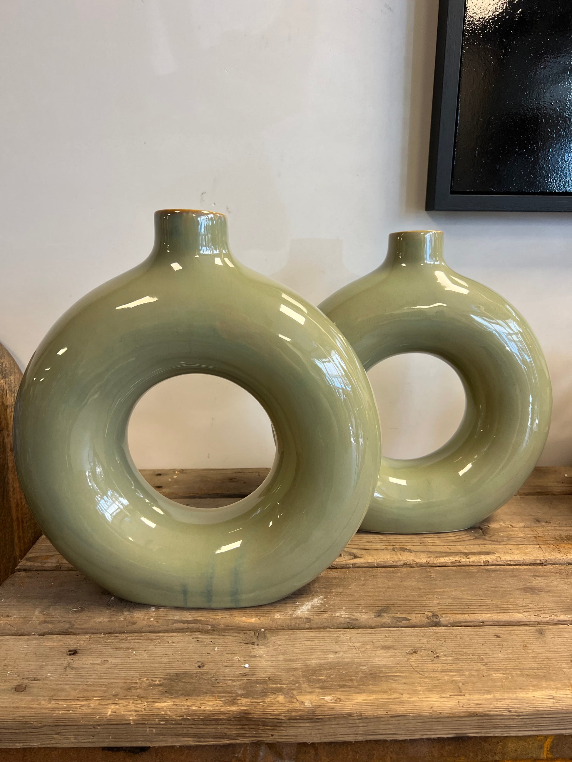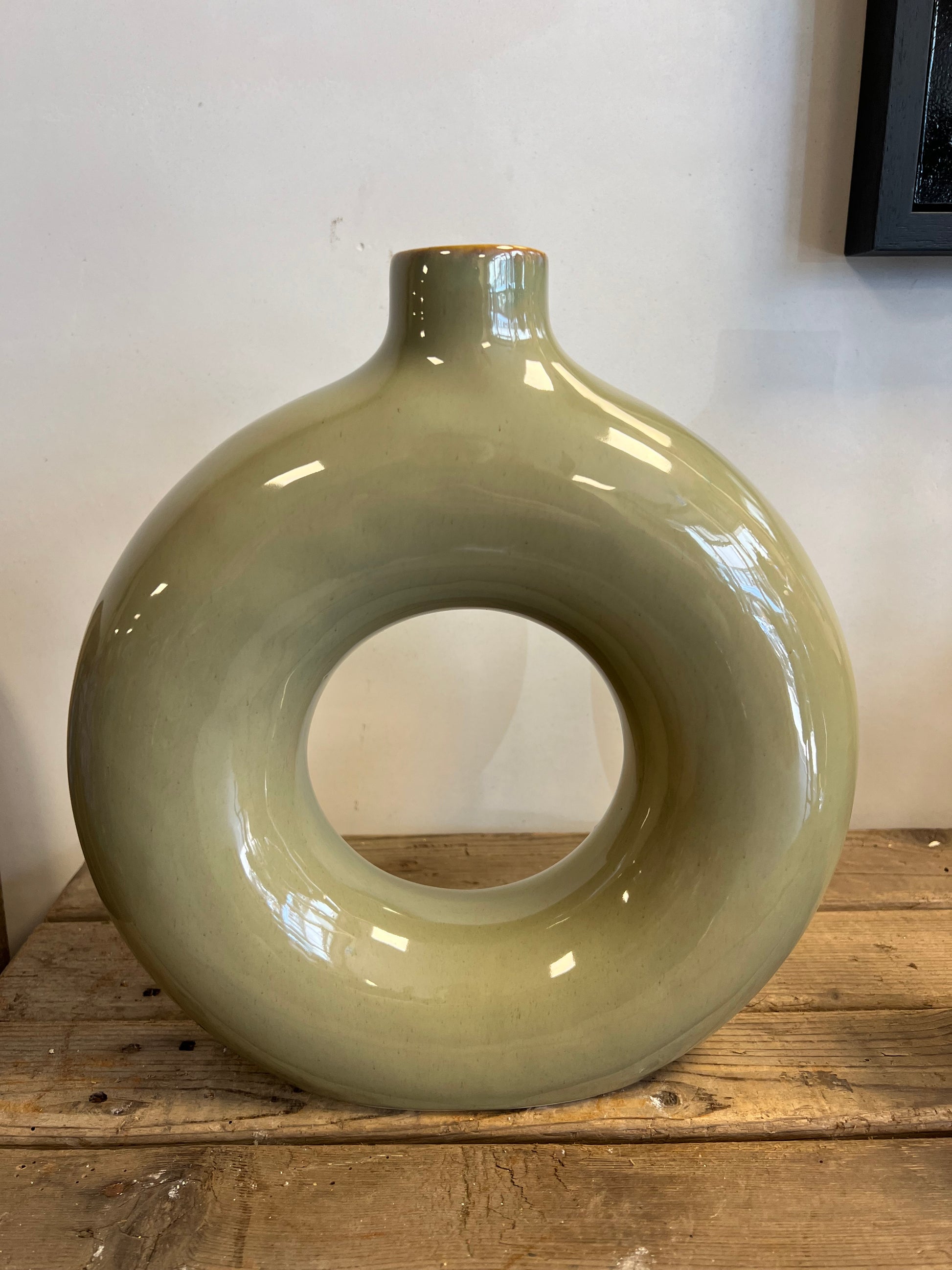 Ontdek de schoonheid van eenvoud met deze handgemaakte vaas, die een verfijnd en modern ontwerp combineert. De unieke ringvorm en het zachte groene glazuur maken deze vaas tot een opvallend decoratief element in elke ruimte.