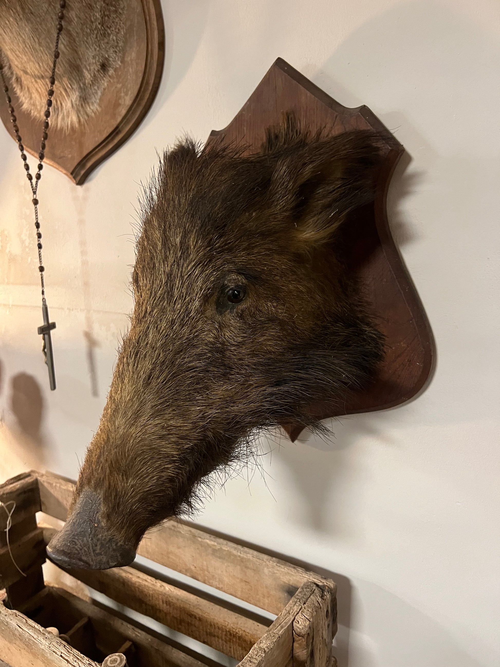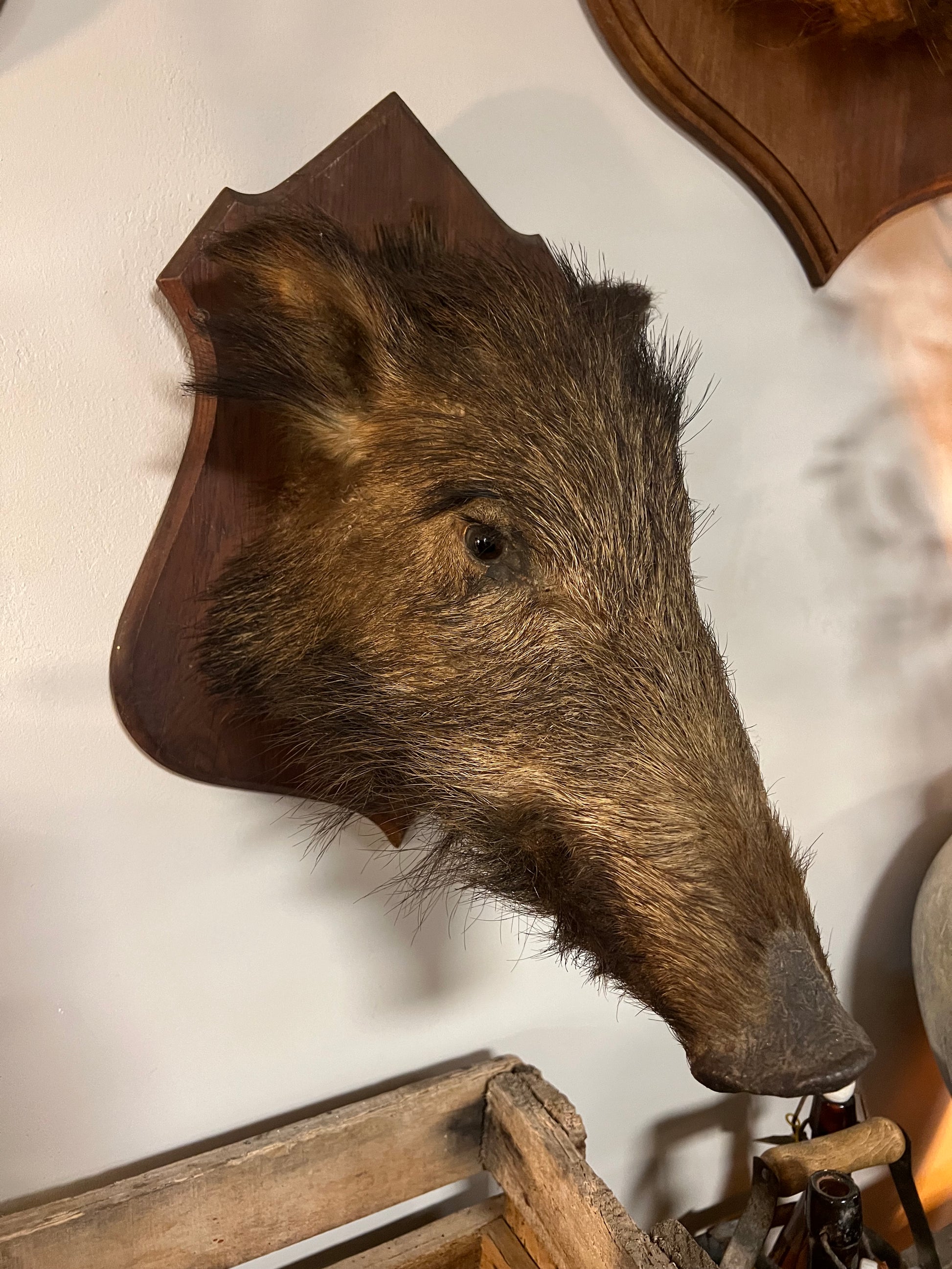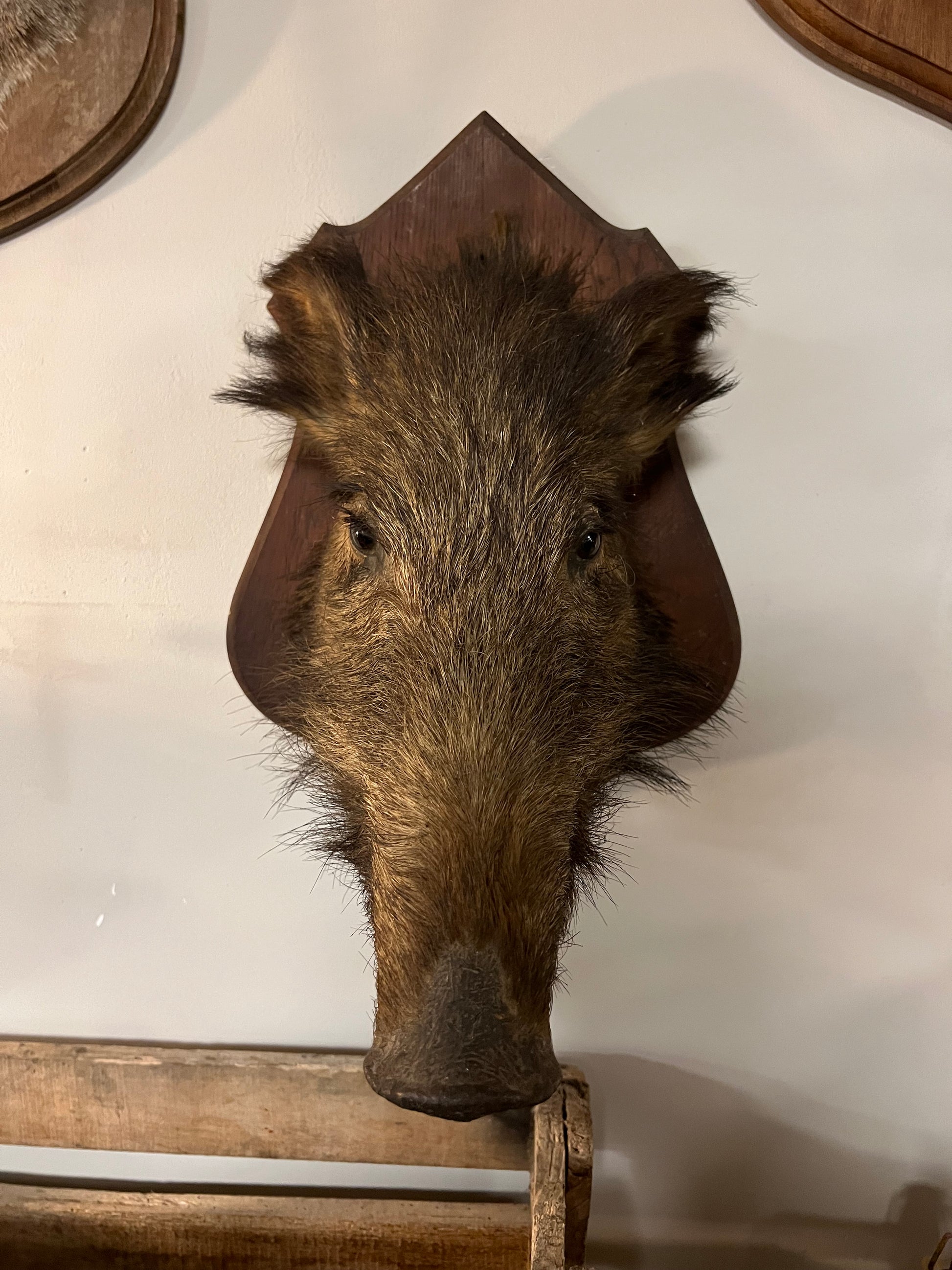 Ontdek de fascinatie van deze oude everzwijnkop uit Frankrijk, een indrukwekkend stuk dat niet alleen een blikvanger is, maar ook een verhaal vertelt. Dit unieke item is perfect voor verzamelaars en liefhebbers van jachtmemorabilia.