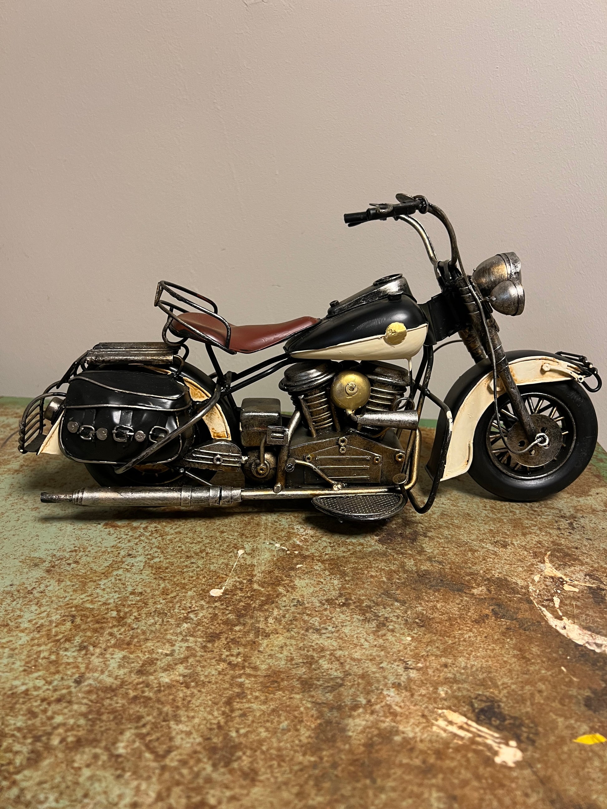 De combinatie van zwart en wit met gouden accenten geeft het een tijdloze uitstraling. Of je nu een motorrijder bent of gewoon een liefhebber van vintage stijlen, deze motorfiets voegt karakter toe aan elke ruimte.