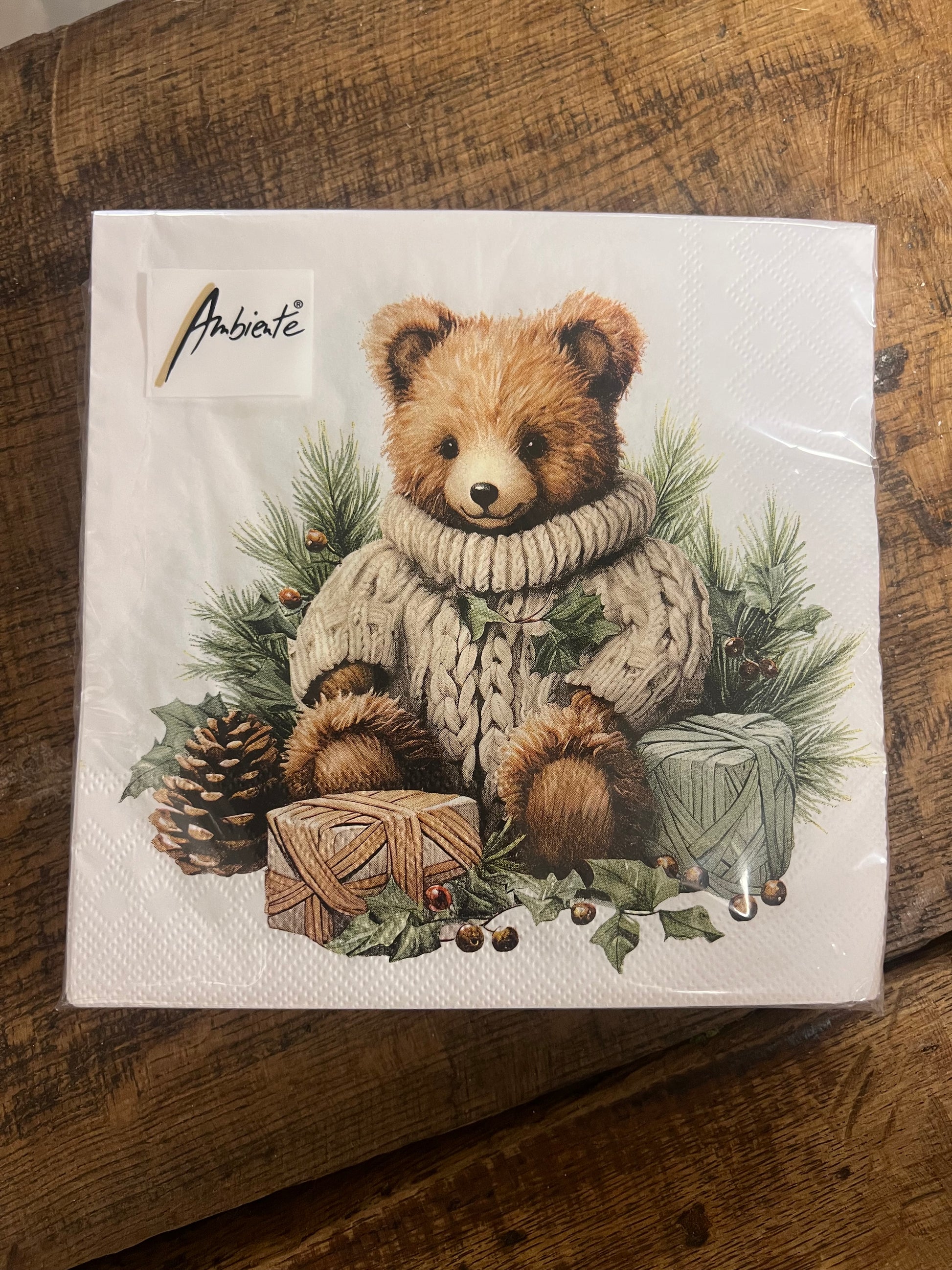Breng een warme en gezellige sfeer aan je kersttafel met onze schattige servetten, afgebeeld met een knuffelige beer in een gebreide trui. Deze servetten zijn perfect voor de feestdagen en voegen een speelse charme toe aan elke setting. Gemaakt van gerecycled papier, zijn ze niet alleen leuk, maar ook milieuvriendelijk.