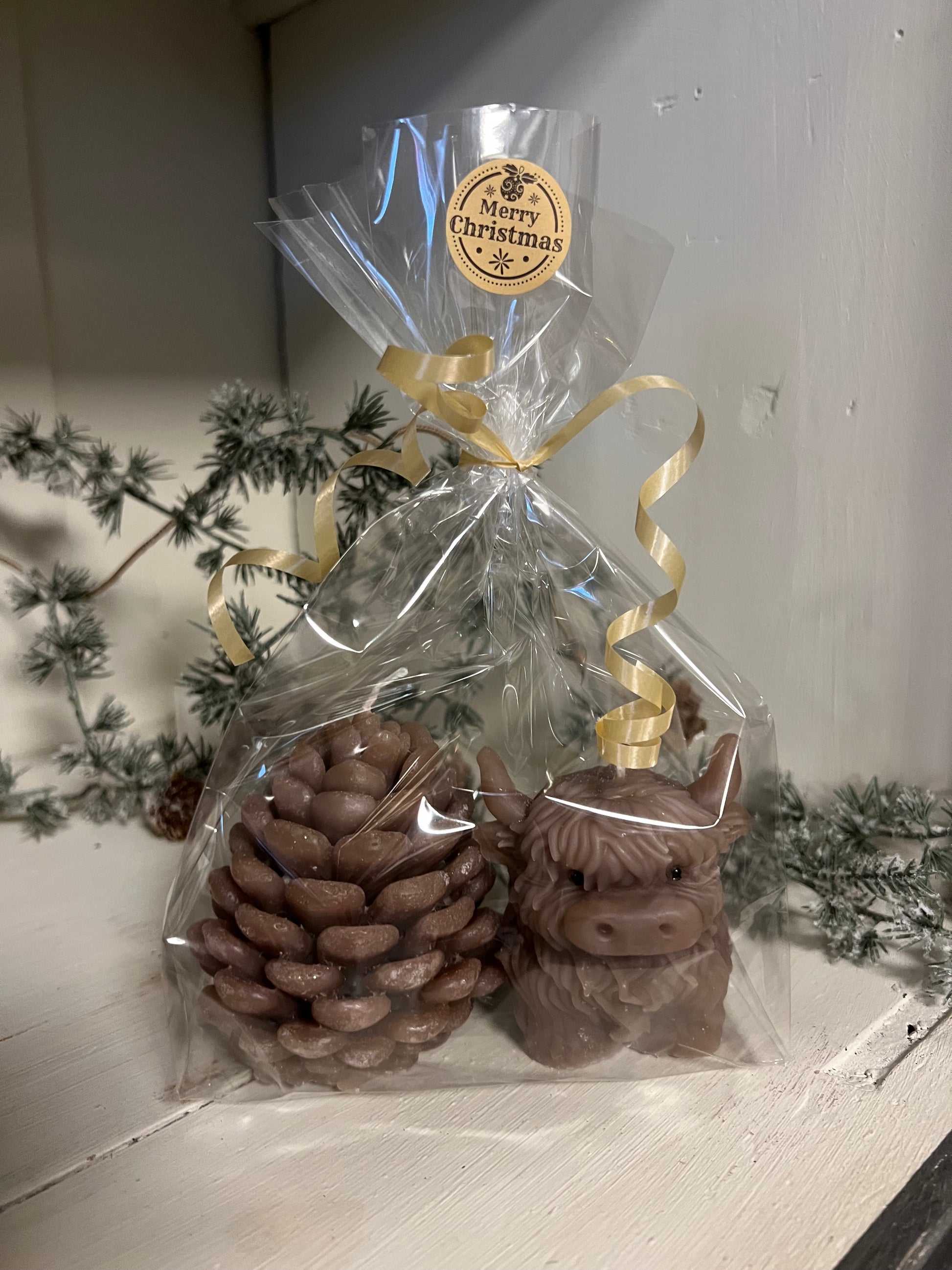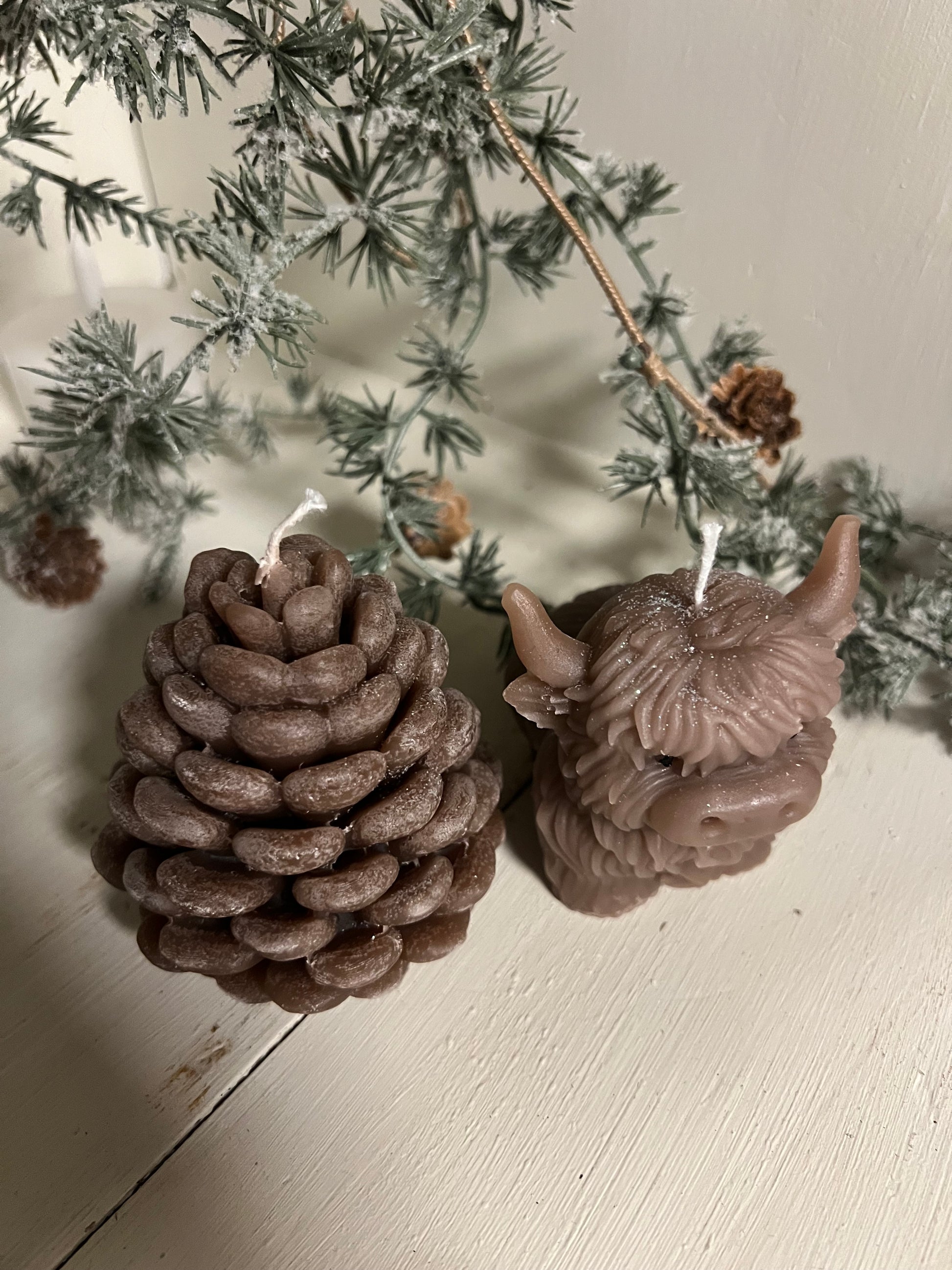 Ontdek onze sfeervolle winterkaarsen: een dennenappel-kaars en een schattige highland-koe kaars.