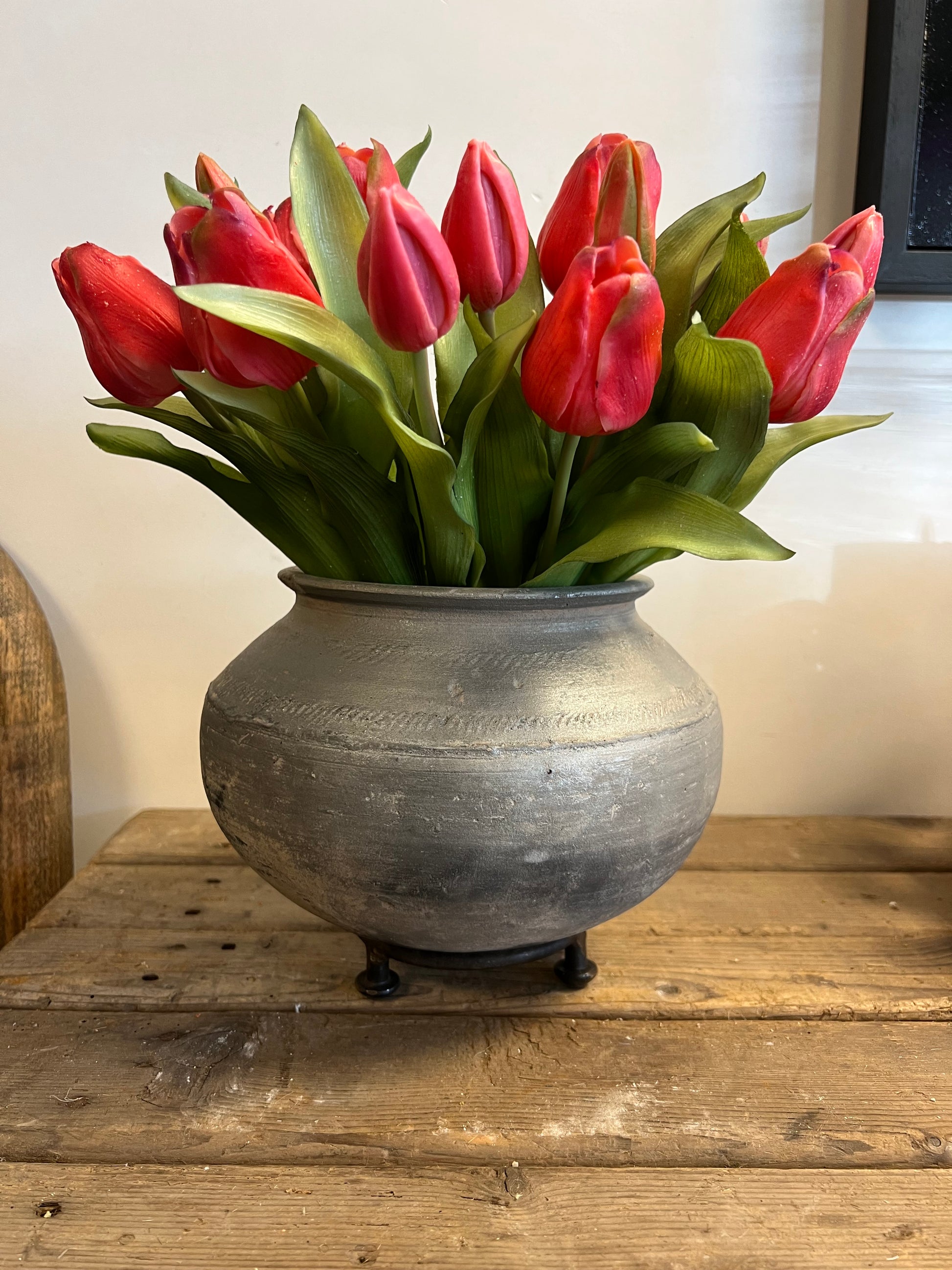 Het tuimelpotje uit India is een prachtig handgemaakt decoratief item dat een vleugje exotische charme aan uw interieur toevoegt. Dit unieke aardewerken potje, met zijn elegante ronde vorm en authentieke afwerking, staat op een stevige ijzeren standaard, wat het geheel een verfijnde uitstraling geeft. Het is perfect voor het presenteren van kleurrijke bloemen zoals tulpen en kan ook dienen als decoratief object of opbergpotje, waardoor het veelzijdig en functioneel is.