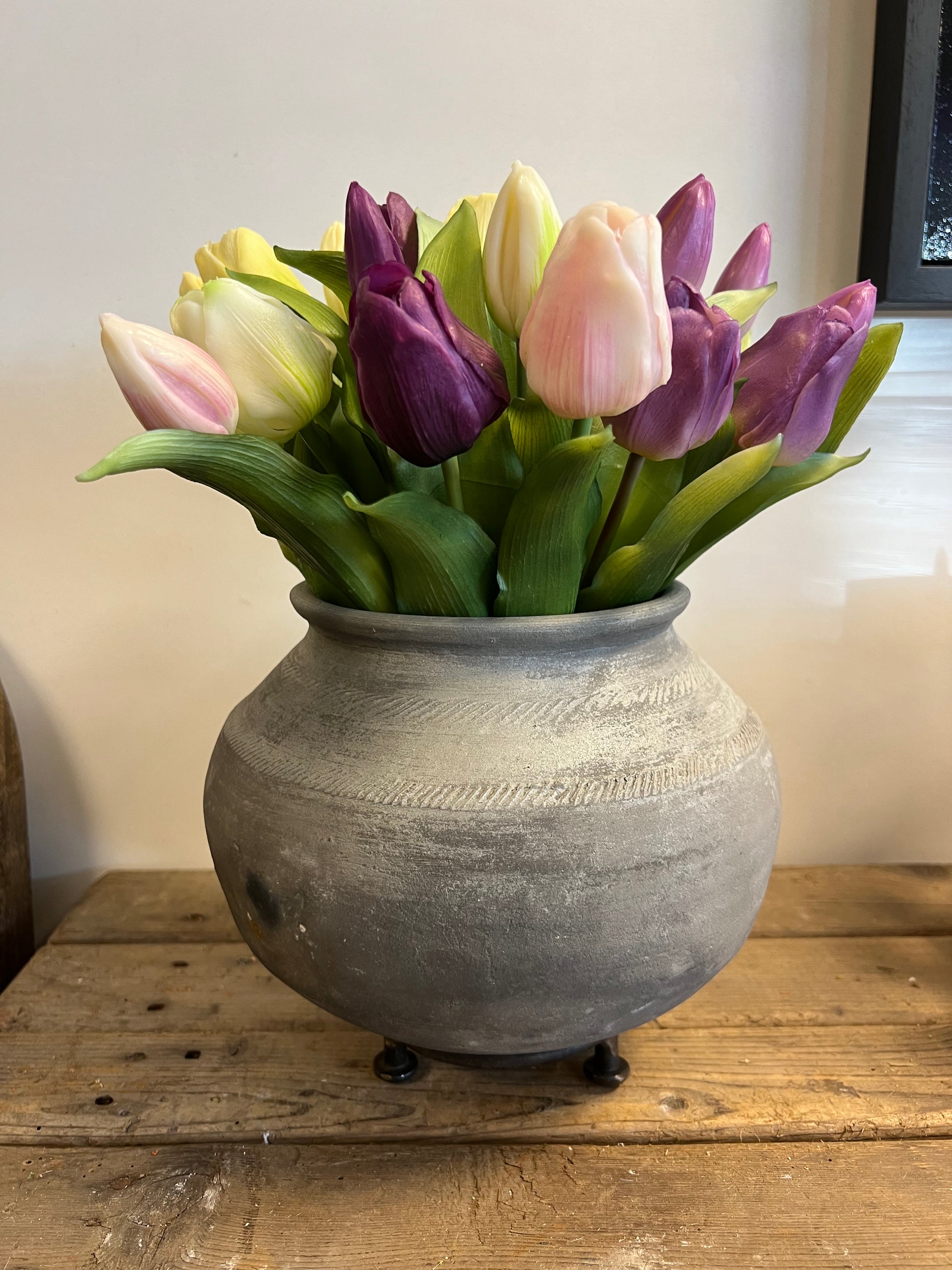 Het tuimelpotje uit India is een prachtig handgemaakt decoratief item dat een vleugje exotische charme aan uw interieur toevoegt. Dit unieke aardewerken potje, met zijn elegante ronde vorm en authentieke afwerking, staat op een stevige ijzeren standaard, wat het geheel een verfijnde uitstraling geeft. Het is perfect voor het presenteren van kleurrijke bloemen zoals tulpen en kan ook dienen als decoratief object of opbergpotje, waardoor het veelzijdig en functioneel is.