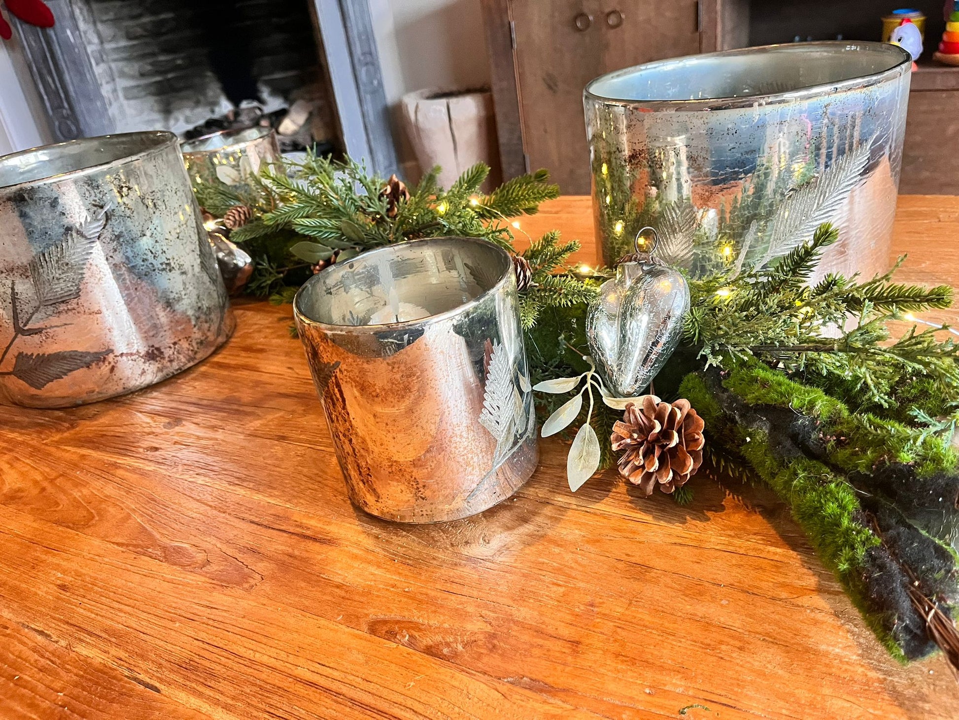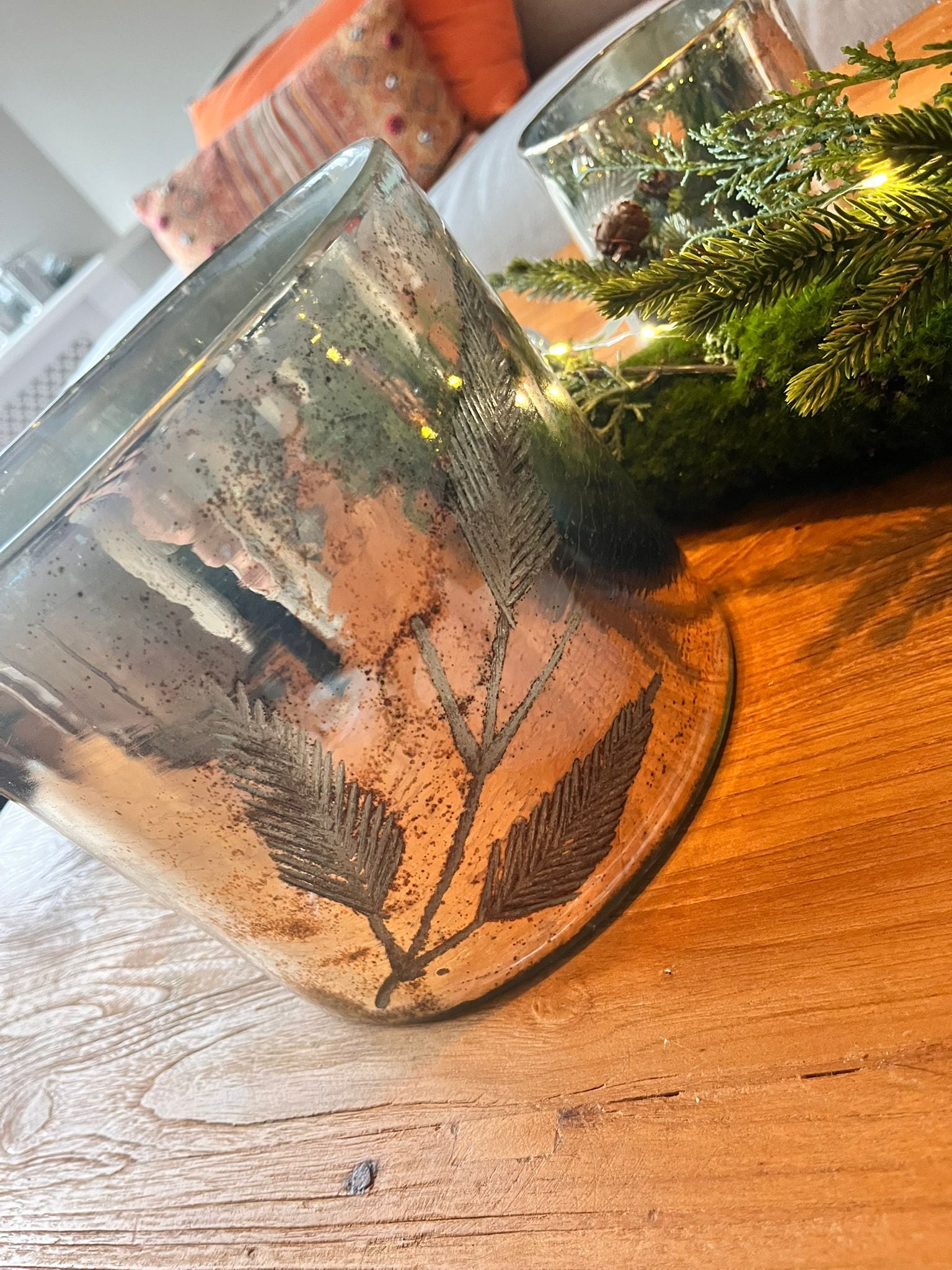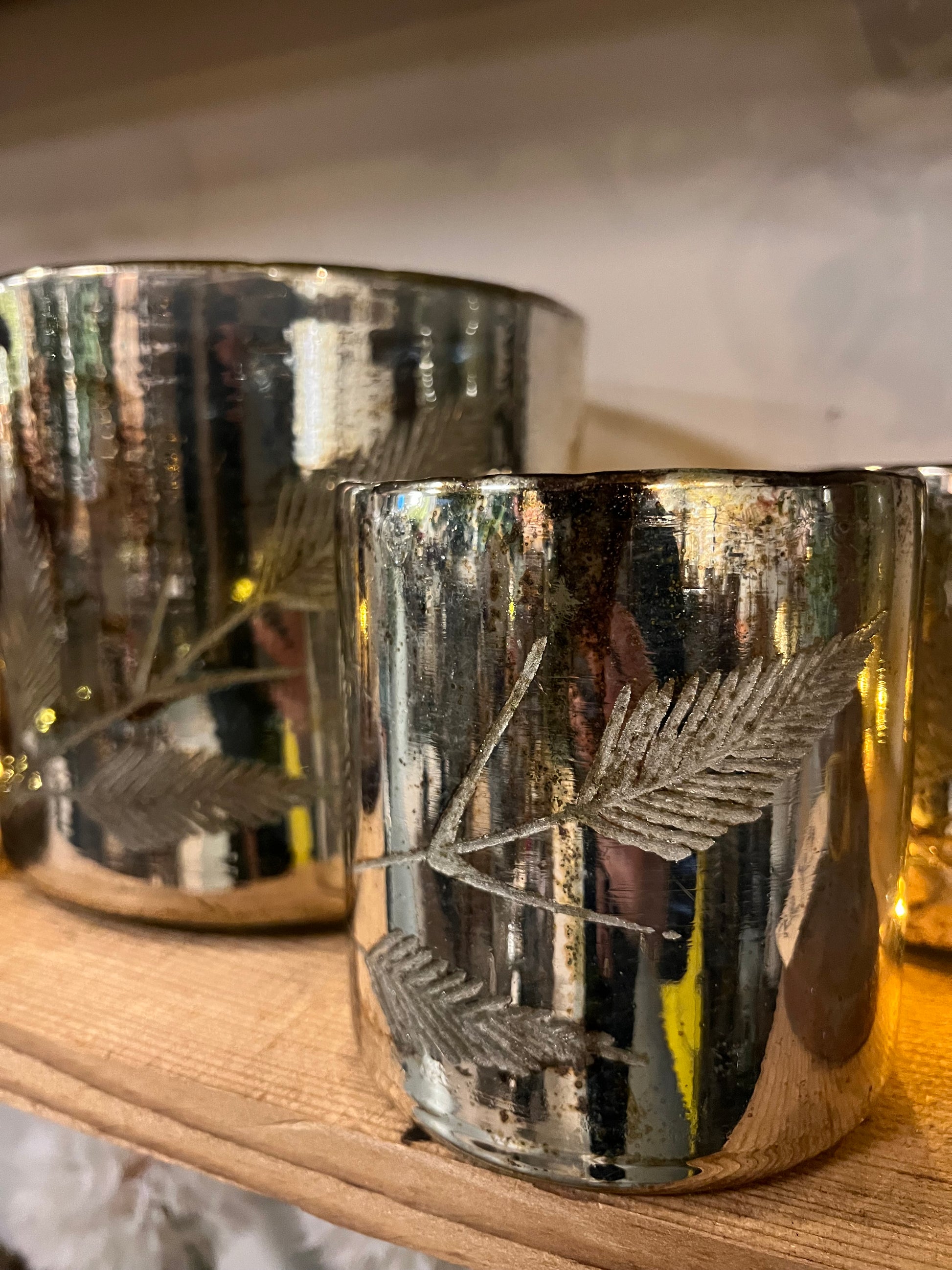 Deze prachtige windlichten in de kleur oud zilver geven elke ruimte een luxe en sfeervolle uitstraling. De oud-zilveren afwerking combineert perfect met de gegraveerde takken, waardoor een stijlvolle en natuurlijke look ontstaat. Het kaarslicht weerkaatst subtiel op het verweerde zilver, wat zorgt voor een warme en bijzondere ambiance. Ideaal als decoratief accent op tafel, in een kast of op een dressoir.